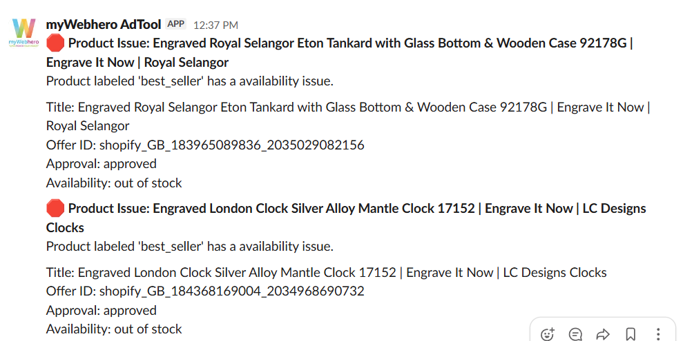 If a monthly budget is exceeded, AdTool pauses campaigns automatically and notifies your team. It also flags Merchant Center issues (e.g., disapproved or out-of-stock) for priority products—alerting once per issue until resolved.